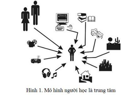 Trong hình 1, có thể thấy người học ở vị trí trung tâm, là chỗ giao nhau của mọi con đường kiến thức. Các kiến thức đến người học không chỉ trực tiếp từ các GV mà có thể từ hệ thống mạng máy tính, qua e-learning, sách vở (sách điện tử), hoạt động nghệ thuật, môi trường tự nhiên, xã hội, gia đình, các phương tiện nghe nhìn. Đặc biệt bài giảng của GV có thể được quay thành Video và thông qua hệ thống máy tính interrnet để đến người học. Như vậy, để có kiến thức, người học không nhất thiết phải đến lớp nghe GV giảng mà có thể thông qua các phương tiện khác nhau để thu nhận kiến thức.