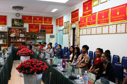 Đoàn gồm các đồng chí Bun-Pon Thon-Su-Van-Na-Lat-Giám đốc Sở, đồng chí Si-Som Phon-Sing_Ha-Lat-Phó trưởng phòng giáo dục phổ thông và 14 tân sinh viên sang nhập học. Sau khi đi thăm cơ sở vật chất phục vụ đào tạo của nhà trường, đoàn đã tập trung tại nhà truyền thống. Tại đây, đồng chí Phạm Chí Cường-Phó bí thư Đảng uỷ, Phó hiệu trưởng cùng các đồng chí lãnh đạo, giảng viên khoa Quốc Tế đã đón tiếp và làm việc với đoàn. Trong buổi làm việc, các đồng chí lãnh đạo Sở giáo dục thể thao tỉnh Khăm Muộn đã trao đổi với nhà trường về tình hình học tập, rèn luyện của lưu sinh viên Lào các khoá trước đồng thời cũng làm các thủ tục bàn giao 14 tân sinh viên khoá mới cho nhà trường để bắt đầu học tập từ năm học 2016-2017.