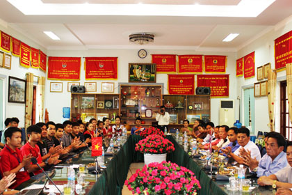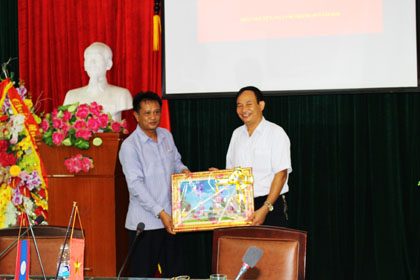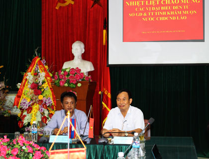 Sau khi đi thăm cơ sở vật chất phục vụ đào tạo của nhà trường, đoàn công tác đã làm việc với lãnh đạo nhà trường về hợp tác đào tạo cho các học sinh của tỉnh Khăm Muộn và gặp mặt các sinh viên Lào khoá trước tại nhà truyền thống.