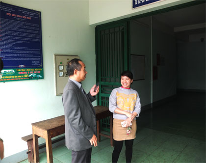 Ảnh : Tham tán Công sứ thăm ký túc xá lưu sinh viên Lào và trao đổi với cán bộ quản lý KTX.