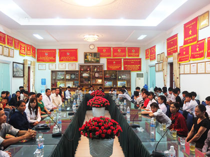 Thày giáo Nguyễn Công Dương-Bí thư Đảng uỷ, Hiệu trưởng nhà trường đã thân mật tiếp đón đoàn tại nhà truyền thống. Trong buổi gặp mặt, thày giáo Nguyễn Công Dương đã trực tiếp giới thiệu các ngành, nghề mà nhà trường đã và đang đào tạo đồng thời thày cũng tư vấn cho học sinh sau khi hoàn thành chương trình THCS nên học TC nghề hay tiếp tục học lên THPT. Sau khi nghe tư vấn, đoàn đã đi thăm quan cơ sở vật chất của nhà trường để tận mắt chứng kiến các điều kiện phục vụ đào tạo, phục vụ sinh hoạt của HS-SV nhà trường.