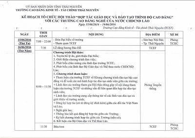 Hội thảo "Hợp tác giáo dục và đào tạo trình độ cao đẳng" với các trường Cao đẳng của nước CHDCND Lào sẽ được tổ chức tại trường CĐ Kinh tế-tài chính Thái Nguyên từ ngày 16/6/2016 đến 19/6/2016.