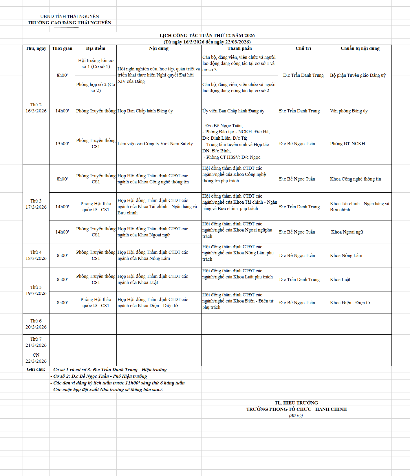 Lịch công tác tuần 12 năm 2026