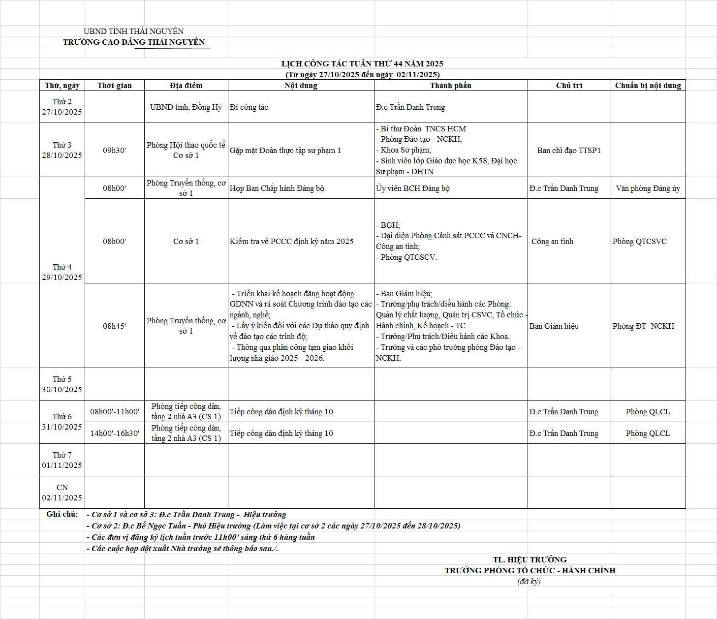 Lịch công tác tuần 44 năm 2025