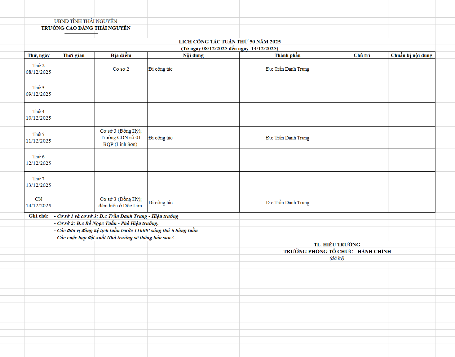 Lịch công tác tuần 50 năm 2025