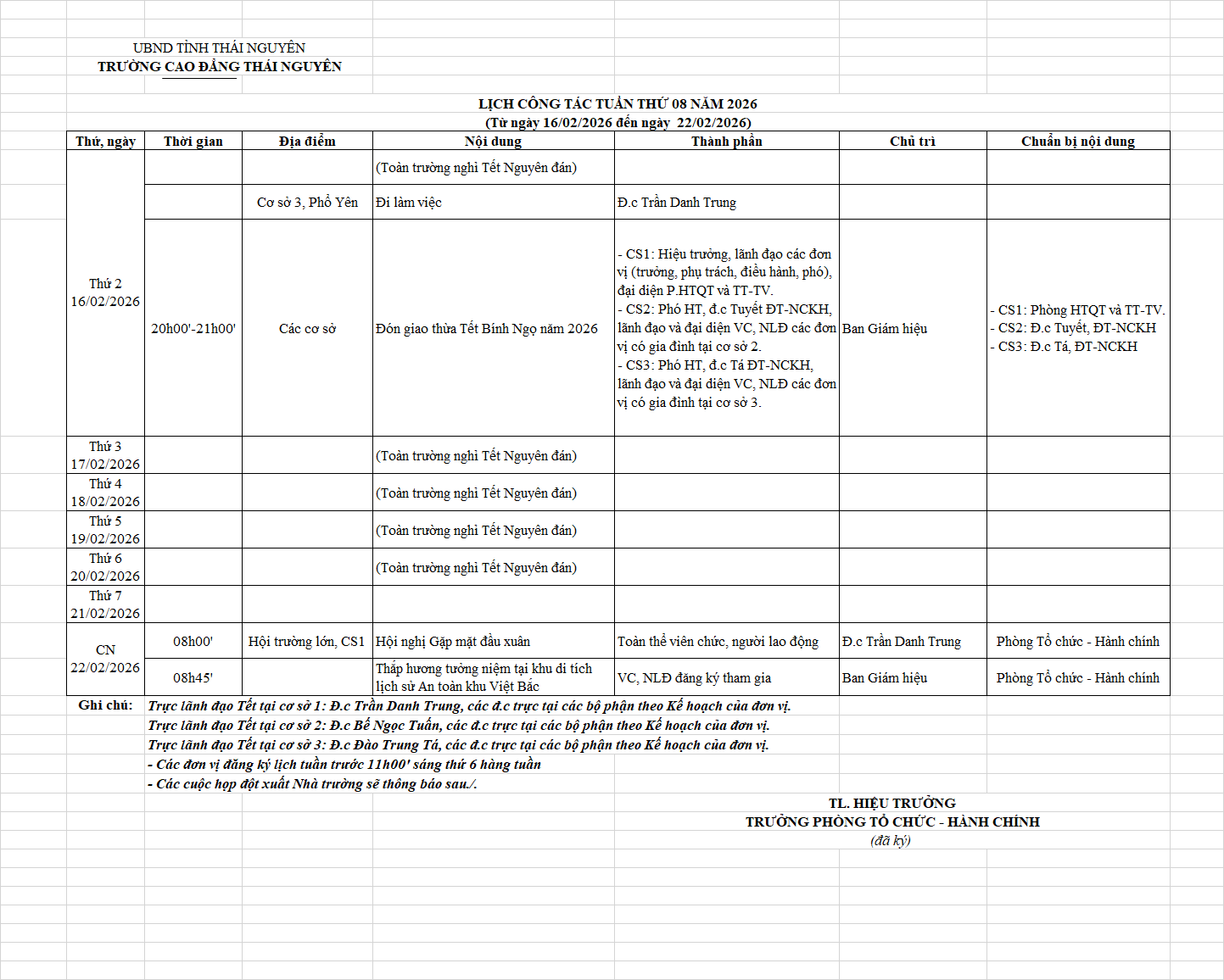 Lịch công tác tuần 8 năm 2026