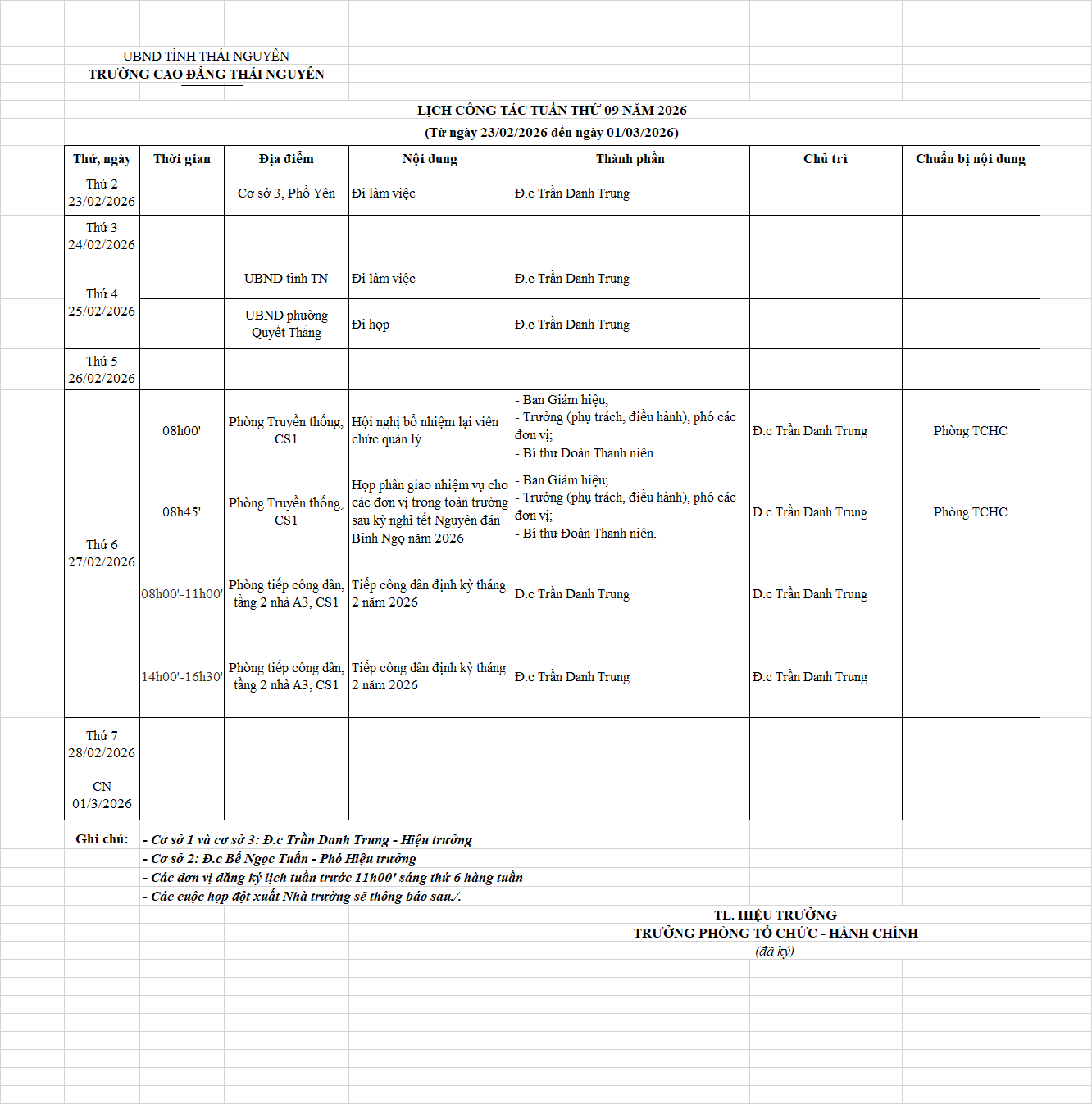 Lịch công tác tuần 9 năm 2026