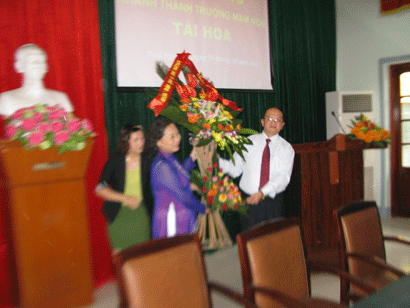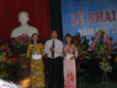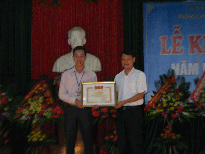 đ/c Bùi Đức Cường - Giám đốc sở giáo dục trao phần thưởng của nhà trường đ/c Vũ Thị Thu và Hà Thị Hường vì đã có thành tích cao trong hội thi giáo viên dạy giỏi toàn quốc năm 2012.