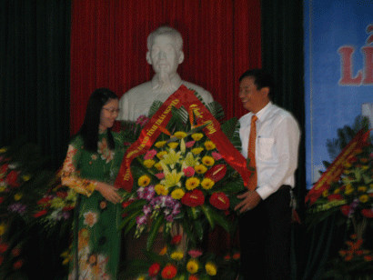 đ/c Nguyễn Công Dương thay mặt tập thể nhà trường đón nhận lẵng hoa chúc mừng của Tỉnh ủy, Hội đồng nhân dân, UBND Tỉnh Thái Nguyên.