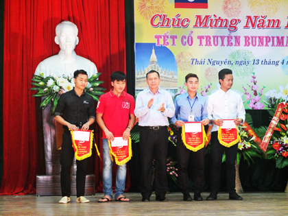 Thày giáo Nguyễn Ngọc Sáng trao các giải thưởng cho đại diện các sinh viên Lào đạt thành tích trong hoạt động thể dục thể thao.