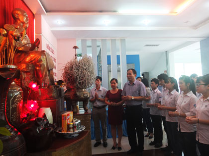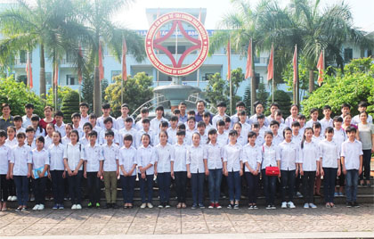 Ảnh : Đoàn chụp ảnh lưu niệm tại đài Lô-gô của nhà trường.