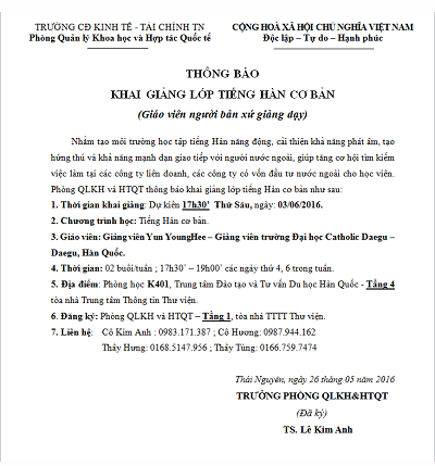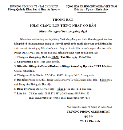 Thông báo khai giảng khoá học tiếng Hàn Quốc, Nhật Bản MIỄN PHÍ tại trường Cao đẳng Kinh tế - Tài chính Thái Nguyên