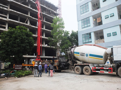 Ảnh : Xe công trình chuẩn bị đổ bê tông mái cuối của toà nhà.