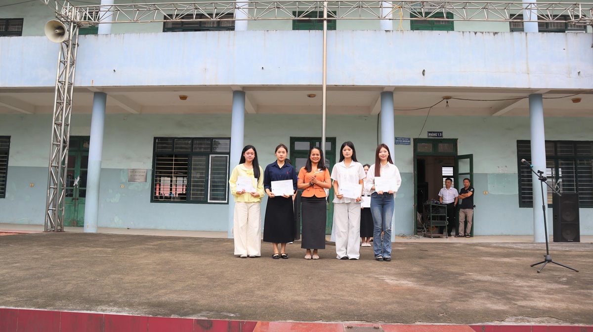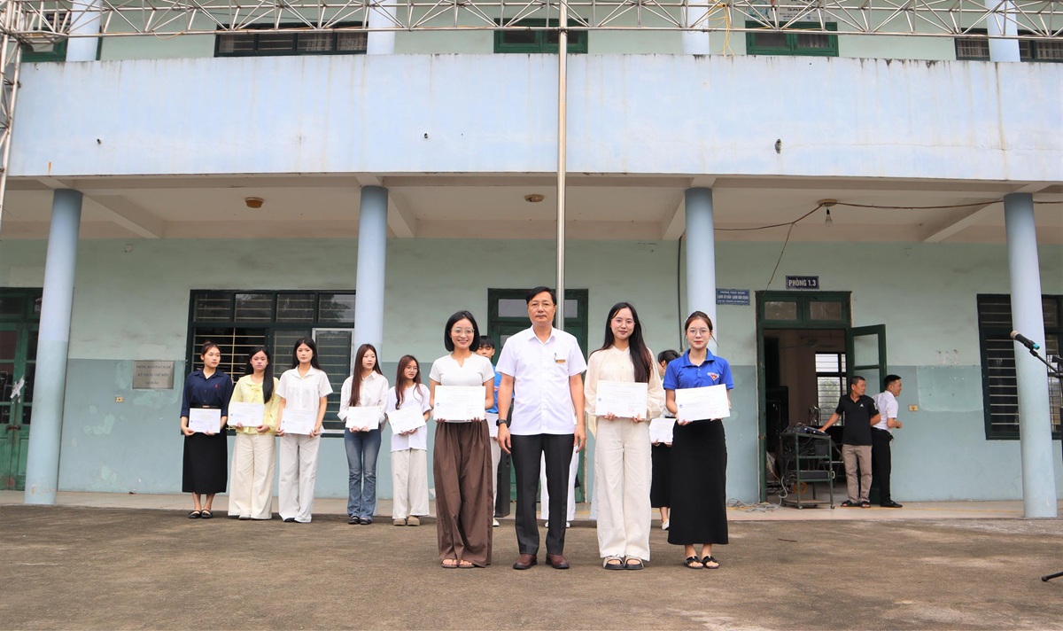 Ảnh: Cô Nguyễn Thị Thu Thơm - Trưởng khoa Bồi dưỡng và Giáo dục thường xuyên trao giải Ba cho các em học sinh, sinh viên đạt giải